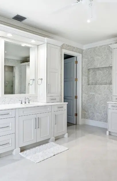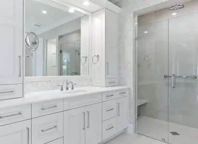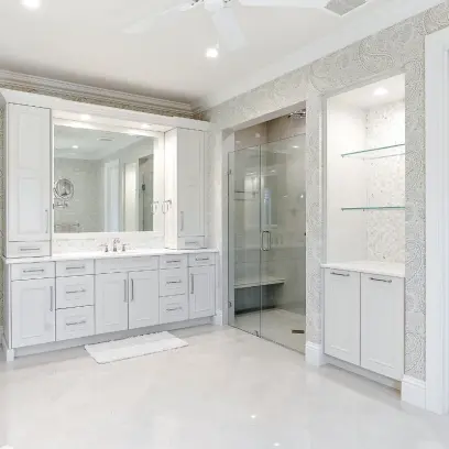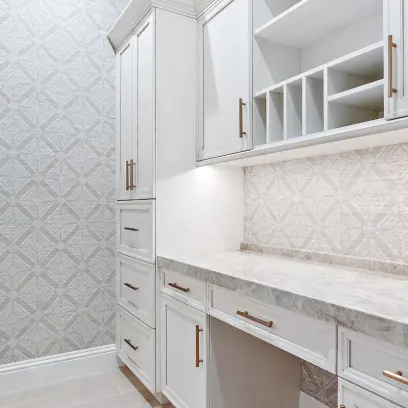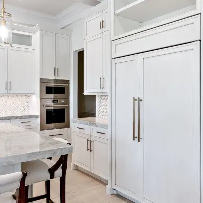 A builder that we have done several projects with previously, retained us to work along side this wonderful couple for their new home in Delray Beach. The Kitchen was a combined effort with us fabricating several highlights in the shop while utilizing one of our customized lines of cabinetry throughout. See the expansive Master Bath along withal of the other rooms….including a custom vanity that we fabricated to mimic a piece the client saw in an Architectural Digest article.