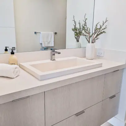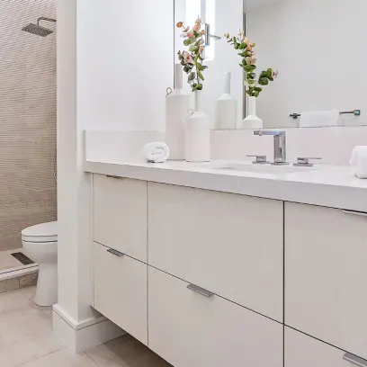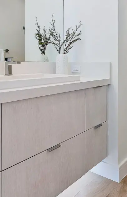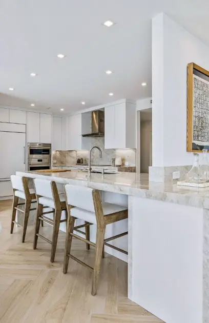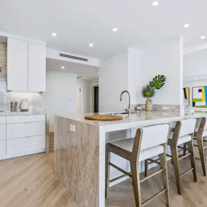 A clean slate condo on Palm Beach Ibis Isle with plans for a soft, comfortable and inviting feel. This project involved opening the space and adjoining the Kitchen with a Dry Bar. We utilized slab door and drawer styles throughout all in a wonderfully soft Acrylic with an Ultramatte finish to accomplish this stunning minimalist/modern look. Walls were clad throughout for the completion of this Kitchen, Bar, Laundry, and Bath areas.
